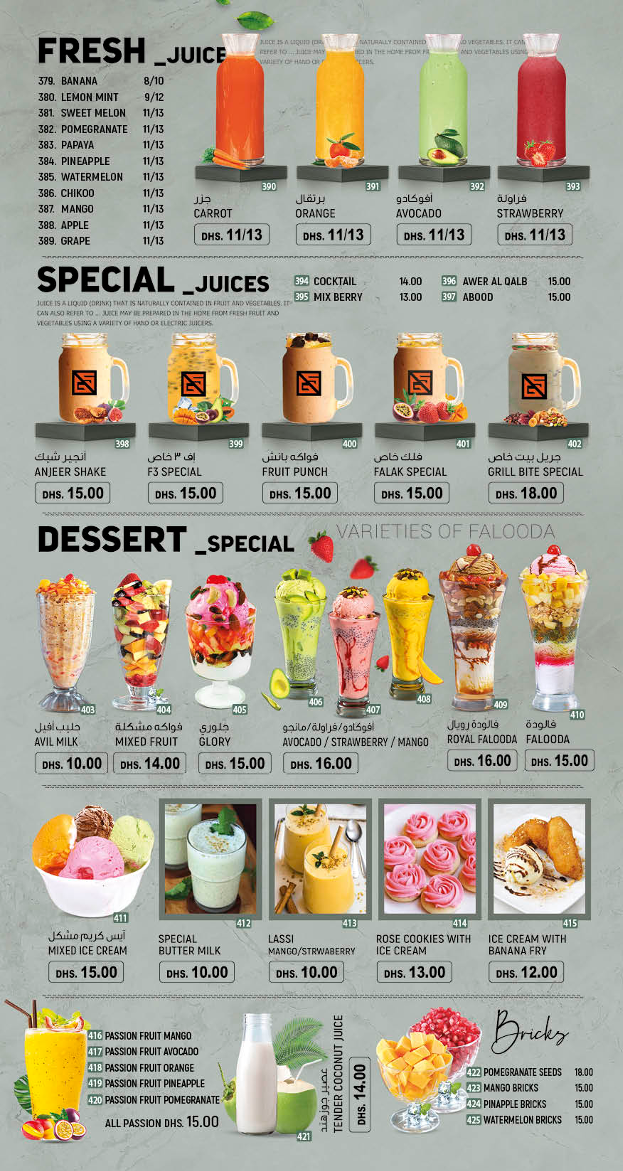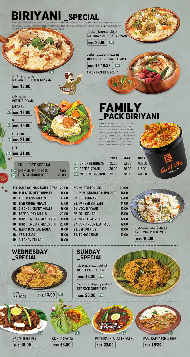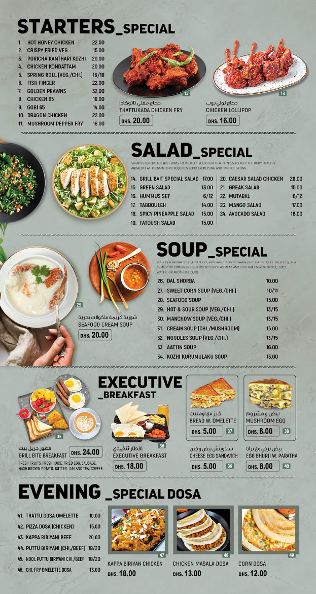 The menu at Grillbite Restaurant offers a relaxed yet diverse dining experience that reflects its unique blend of Arab, South Indian, and seafood cuisines. You’ll find a range of fresh salads and light starters perfect for a casual lunch or a refreshing accompaniment to any meal. Options like the Grill Bait Special Salad or the spicy pineapple salad bring fresh flavors that suit a warm day or a relaxed café moment.